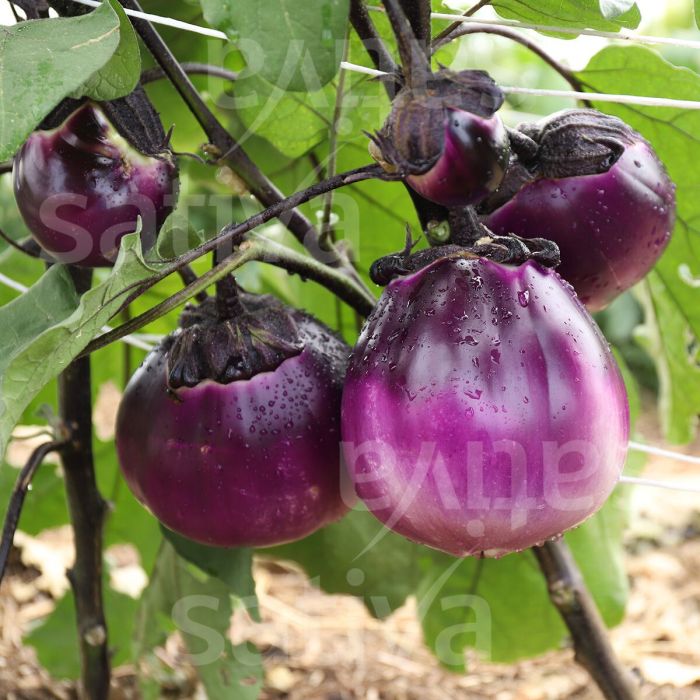 Middelgrote tot grote aubergine met eivormige, helderpaarse vruchten en mals, smakelijk vruchtvlees. Door de sierlijke witte kleur rond de kelkblaadjes is dit ras zeer decoratief.