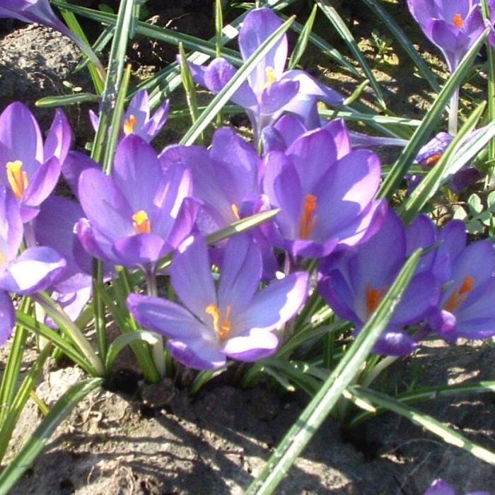 Boerenkrokus uit de tommasinianus groep, paarse bloem met geel/oranje meeldraden