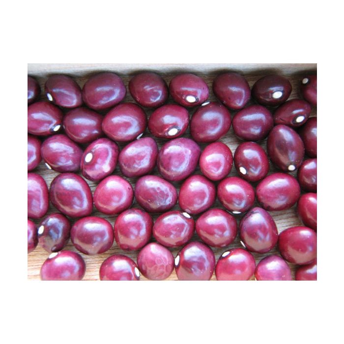 Vroege, heel productieve soort met veel kleine gele peulen.  Heel mooie ronde, roze-bordeauxrode bonen.  Wordt droog gegeten.