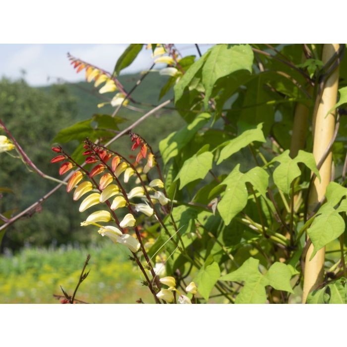 De één na de ander openen de prachtige bloemschermen van Mina lobata de bloemen met een kleurspel van rood over geeloranje naar helder wit. Ze is zeer warmtetolerant en bloeit de ganse zomer door. Als rankende sierplant ideaal voor een plantenklimrek of voor een groen balkon. Ook bekend onder de naam Spaanse vlag.