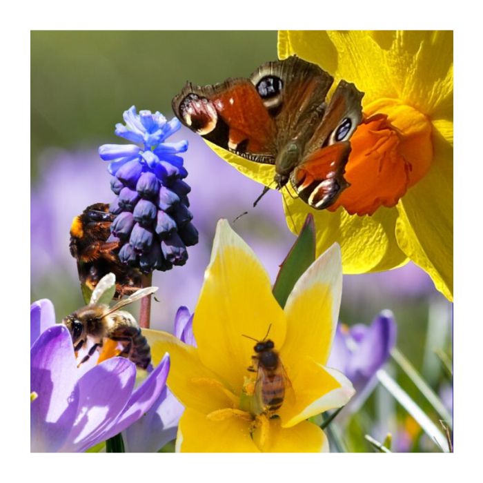 Wij hebben dit speciale mengsel samengesteld voor de kleine tuin of het balkon. De variëteiten van de krokussen, narcissen, blauwe druifjes en botanische tulpen kunnen afwijken van de foto, maar zijn altijd aantrekkelijk voor bijen, hommels en vlinders.