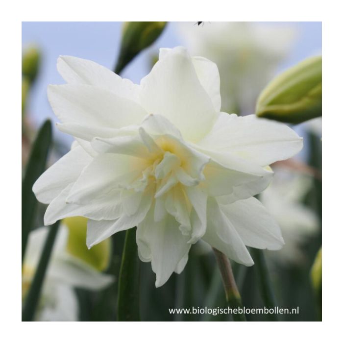 Narcis Calgary met haar kenmerkende grote witte ruches. De dubbele bloem met fijn gegolfde blaadjes komt op met een creme kleur om al rijpend te verkleuren naar een glanzend maagdelijk wit. Er kunnen 2 bloemen per steel groeien. De magnifieke afstammeling van de narcis Thalia bloeit van midden tot laat in het seizoen en dan het liefst in een vruchtbare niet de drassige grond. Dan zal ze zich ook vermeerderen. Je kunt proberen om de bol in een rode biet te planten. In plaatst van wit zullen de bloembladeren lichtroze kleuren.