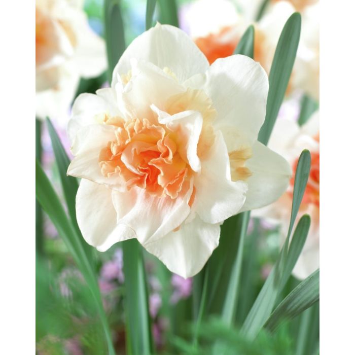 Narcis Replete produceert heldere witte bloemen, met een gevuld hartje in een zachte roze, abrikoos kleur. Een mooie kleurencombinatie die bewijst dat de narcis zoveel meer is dan het stereotype gele bloem die vele kennen.