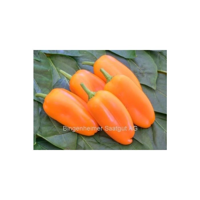 Snackpaprika voor veld en kas. Feloranje vroegrijpe vruchten, 7-8 cm lang. Bijzonder goede smaak.