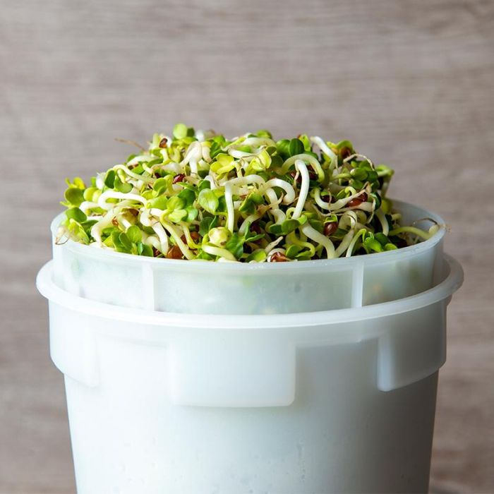Indien nodig het water dagelijks weer even aanvullen tot de onderzijde van het rooster. De radijs kan het best bij kamertemperatuur op een vrij lichte plaats worden weggezet. Oogst: Na ongeveer een week kunnen de kiemspruiten gegeten worden.