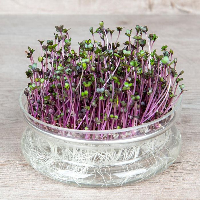 Kiemgroenten Rode Kool heeft mooie rood met groene kiempjes en een echte koolsmaak. Wanneer u rode kool als kiemgroente wilt zaaien dan is hier een speciale glazen bowl met rooster voor beschikbaar. De zaden moeten in een dun laagje over het rooster worden uitgestrooid, vervolgens kunt u de glazen bowl met water vullen tot de onderzijde van het rooster. Indien nodig het water dagelijks weer even aanvullen tot de onderzijde van het rooster. Oogst: Na ongeveer een week kunnen de kiemspruiten gegeten worden.