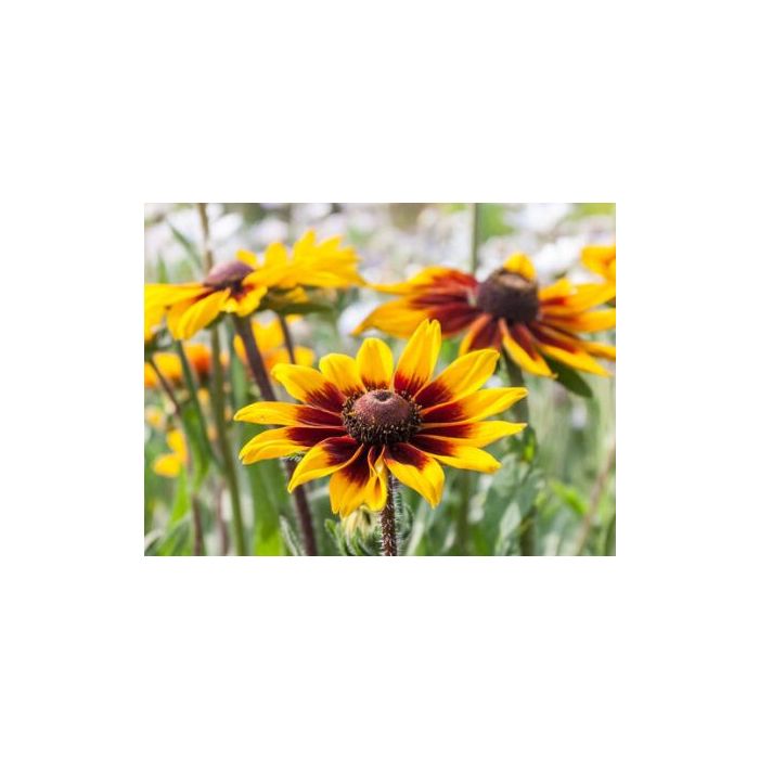 Sterkgroeiende Rudbeckia me contrasterende bruinrode en geel getinte bloemblaadjes. Zeer robuust met grote bloemhoofden. Bijzonder lang houdbaar in de vaas.