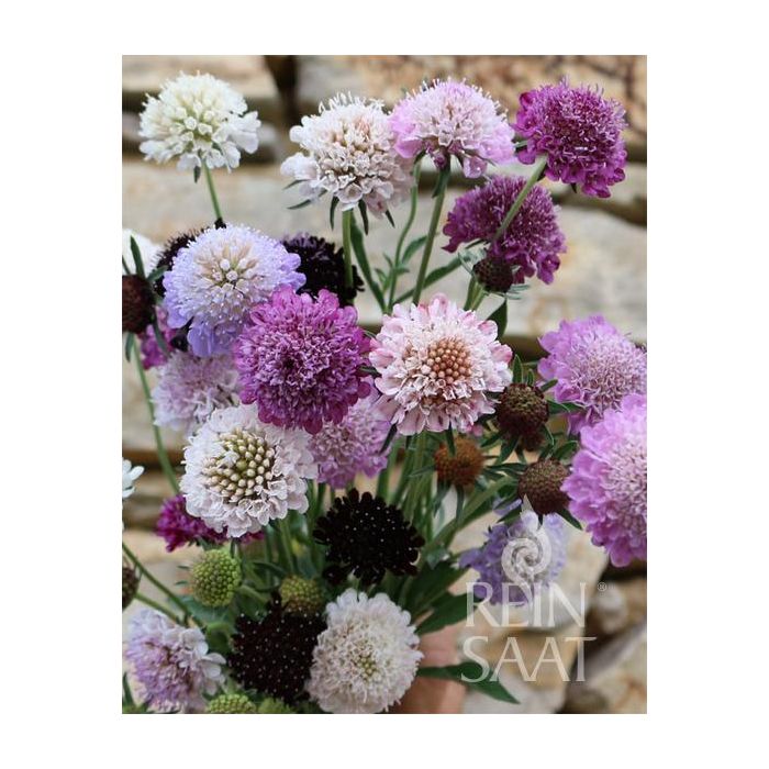 Scabiosa atropurpurea Donkerpurper is een sierlijke zomerbloeier die ongeveer 80 cm hoog wordt. De intens purperrode bloemhoofden staan op lange, stevige stelen en zijn daardoor zeer geschikt voor snijbloemen en natuurlijke boeketten.