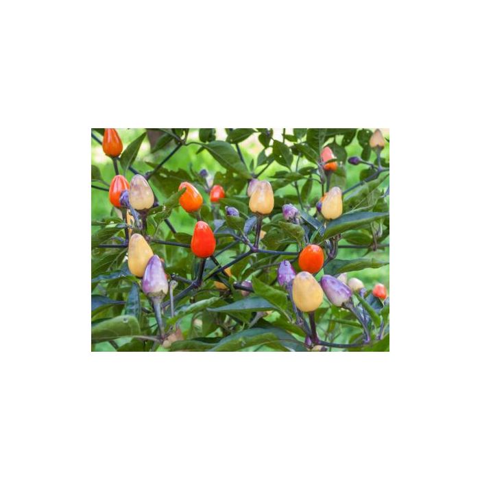Decoratieve, productieve chilipeper met paarse bladeren en zeer kleine vruchten. De vruchten rijpen van paars over geel en oranje naar rood af. Bijzonder geschikt voor teelt in