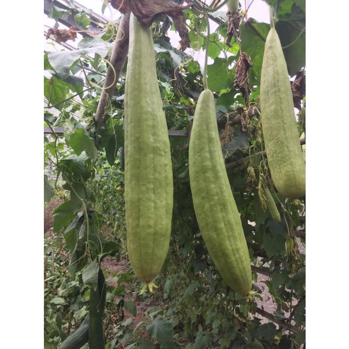De vruchten worden makkelijk zo dik als een courgette en in een goed seizoen bij ons tot 60 cm lang. Deze kunnen in een jong stadium geoogst zelfs geconsumeerd worden in bv soep.