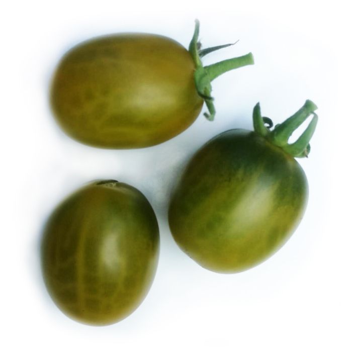 Een relatief kleine, groene pruimtomaat. Is oogstklaar als de kleur van hetzelfde groen als de bladeren verandert naar mosterdgroen. Zoet van smaak.