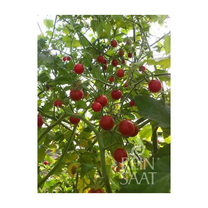 Wilde tomaat van ReinSaat's EHZ. Vormt een woud van helder roodpaarse, kleine tomaatjes zonder te binden of uit te knijpen. De ontelbare, ongeveer 1,5 cm kleine vruchten zijn uiterst smakelijke knabbeltomaatjes. Heeft weinig water en mest nodig. Bestand tegen meeldauw en vruchtrot. Vruchtgewicht ongeveer 5 g.