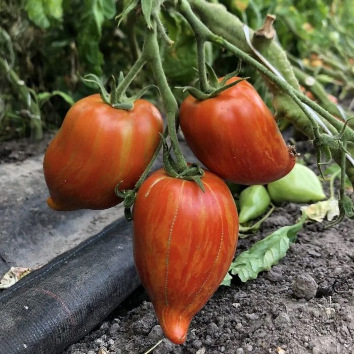 Ongewone, niet-zelftoppende, rode Roma-tomaat met geel-oranje gevlamde huid. Zeer vlezig, geeft weinig sap af en erg smaakvol. Vruchten van ca. 100-200g. Geeft een goede opbrengst aan vruchten maar verdraagt wel wat schaduw op de middag. Zowel voor passata als voor slaatjes.
