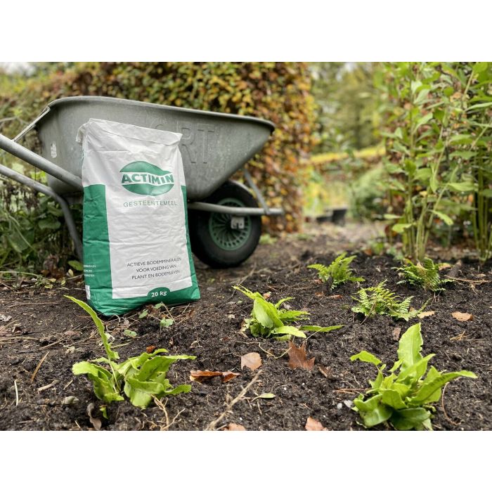 Actimin-BT gesteentemeel bevat meer dan dertig verschillende (sporen)elementen en maar liefst 92 procent actieve bodemmineralen waardoor het bijzonder geschikt is voor de voeding van planten en bodemleven. Het verbetert de structuur en de vruchtbaarheid van de bodem.