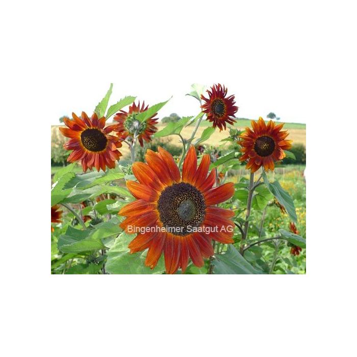 Uitzonderlijke zonnebloem met een expressieve, fluweelachtige roodbruine kleur. Een bijzondere blikvanger voor de cottage tuin. De bloemdiameter is ongeveer 20 cm. Voedzame grond en een constant goede watervoorziening zijn voorwaarden voor krachtige planten.